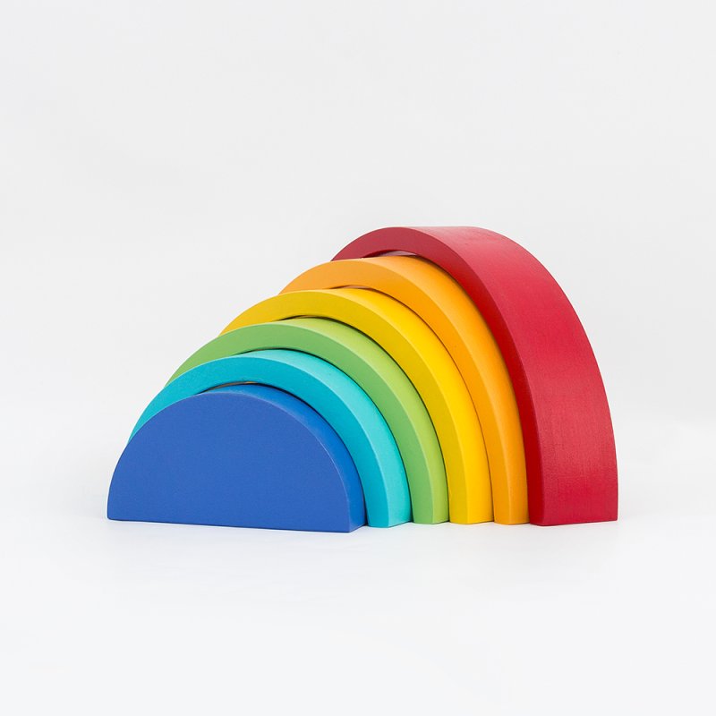 Y tantas otras cosas por descubrir con el ARCOÍRIS DE 6 PIEZAS. Sumergidos en la simpleza del arcoíris nos adentramos a un mundo mágico, descubriendo un amplio abanico de posibilidades por su gran versatilidad, dado que sus piezas pueden ser apiladas, ordenadas por tamaño, alineadas, y con ellas construir innumerables escenarios de mayor tamaño que recreen historias de la vida real (pueden ser puentes o túneles para los autos, torres, montañas, casas para los muñecos, laberintos de bolitas) fomentando el juego simbólico, la creatividad y la imaginación. Sus piezas pueden apoyarse desde diferentes bases otorgando la posibilidad de construir figuras tanto bi como tridimensionales, de gran altura o superficie. Fomenta la estimulación de funciones cognitivas como el uso de la lógica, la concentración, la atención, la resolución de problemas, presentándose desafíos de equilibrio y contrapesos en las construcciones. Por tener duplicadas sus piezas ofrece un plus de estimulación, pudiendo trabajar con él las simetrías, categorizar las piezas por tamaño y color. Es un producto tan versátil que se complejizará a medida que el niño crezca y desarrolle habilidades.